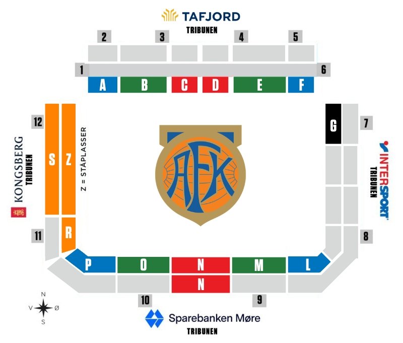Oransje felt (ståtribune Z): 100 kr for voksen / 50 kr for honnør / 50 kr for U18